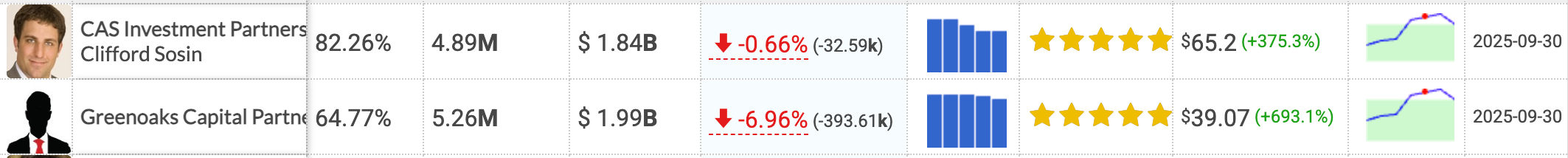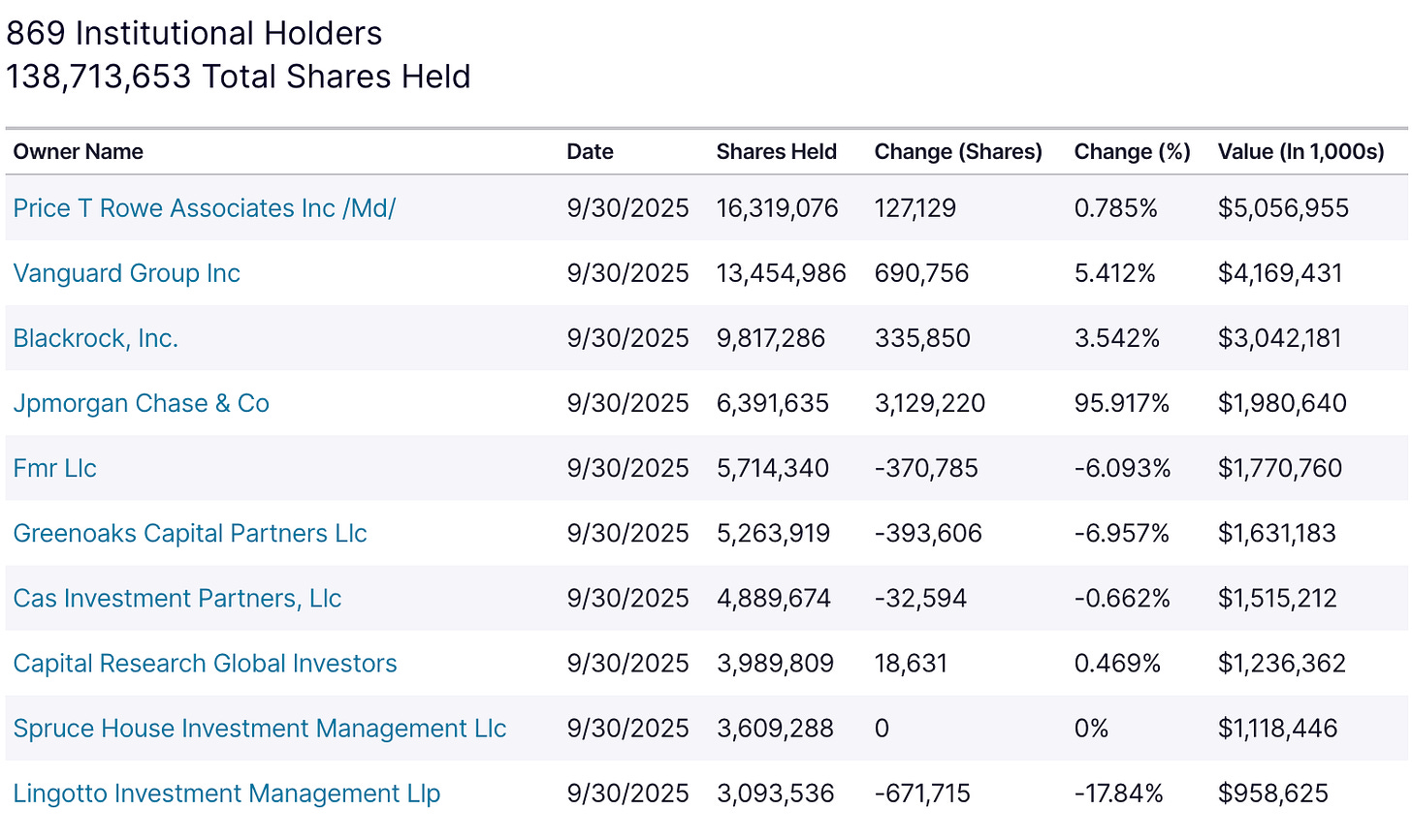 The next 3 largest holders who are the largest active funds are FMR, Greenoaks Capital, and Cas Investment Partners. These institutions key to the thesis because they own such a large % of the company. As you can not only are they selling, but the other active institutions have been as well.