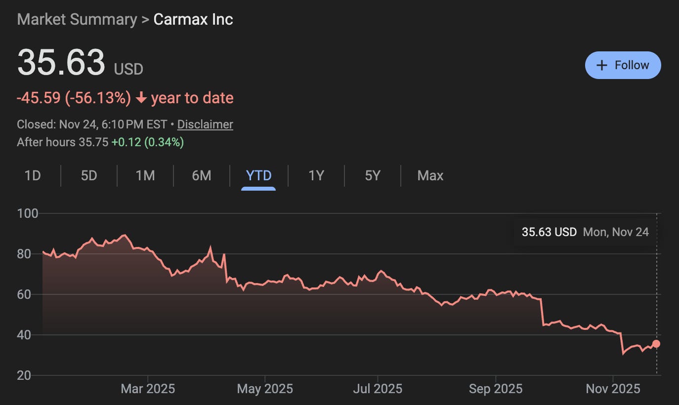 CarMax is down ~56% YTD as it struggles through a difficult auto retail environment.