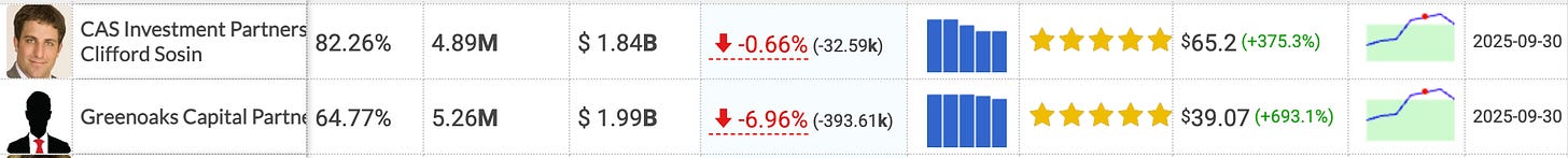 Looking at CAS and Greenoaks, they are both heavily concentrated in the stock. Carvana makes up 82.26% and 64.77% of their portfolios respectively. They have both been selling the stock, which may seem like normal profit taking on a large position, but they are forced to have minor trims. If they sold a large portion of their position, because the float is so limited, there would be no natural buyers to absorb the supply and the stock would fall sharply.